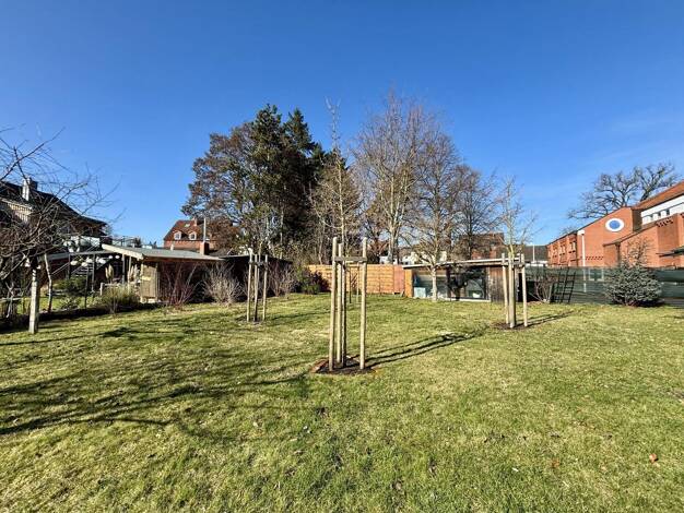 Das unter Ensembleschutz (Form des Denkmalschutzes, die nicht einzelne Gebäude schützt, sondern das städtebauliche Gesamtbild eines historischen Bereichs) gehört zu einer einheitlich konzipierten Gar...