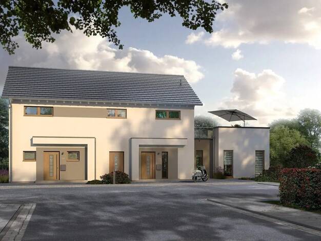 Objektbeschreibung Das Doppelhaus Aura 115 ist die ideale Kombination aus urbanem Lebensgefühl und ländlichem Charme – und bietet viel Raum für eigene Ideen. Auf rund 118 Quadratmetern Netto-Raumfläc...