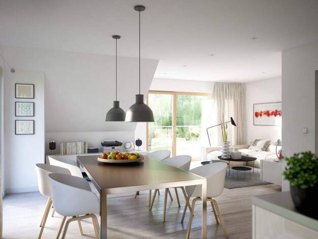 Bei diesem Zweifamilienhaus mit klassischem Satteldach von 38 Grad Neigung liegen die beiden Wohneinheiten übereinander. Das Treppenhaus verbindet die beiden Einheiten, die vom Aufbau her beinahe ide...