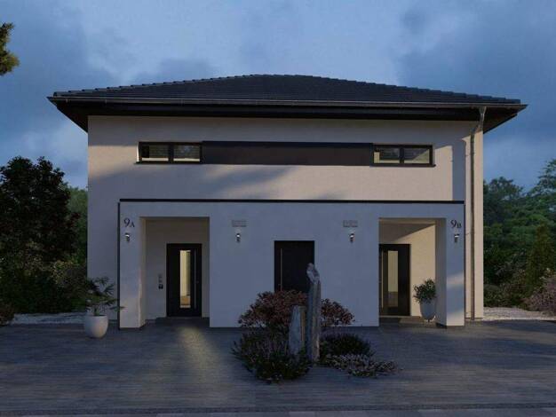 Ein Doppelhaus mit besonderem Maß an Eleganz: Das harmonische Walmdach verbindet die beiden Haushälften optisch zu einer Einheit und verleiht dem Gebäude eine großzügige, repräsentative Wirkung. So e...