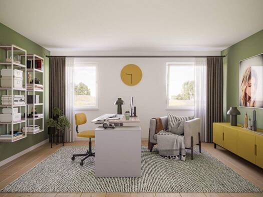 Zwei identisch gespiegelte Grundrisse bieten auf jeweils zwei Etagen komfortables Wohnen unter optimalem Kosten- und Nutzenaspekt. Der attraktive Eingangsbereich mit Windfang, Abstellraum und WC führ...