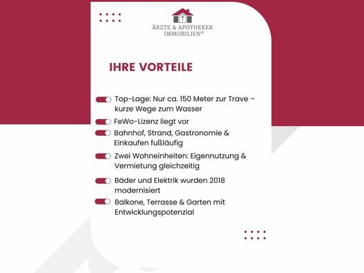 Entdecken Sie dieses außergewöhnliche Ensemble aus drei separaten Ferienhäusern in einer der begehrtesten Lagen von Travemünde! Die insgesamt vier exklusiven Wohneinheiten bieten vielfältige Nutzungs...