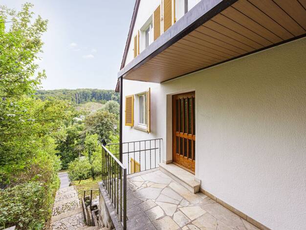 Unverbaubare Ausichtslage mit Blick über das Lautertal zum Juxkopf, großer angelegter Garten mit 1000den Frühblühern und mit direktem Zugang zum Wald . Bis zu 2 m breiter überdachter Holzbalkon nach ...