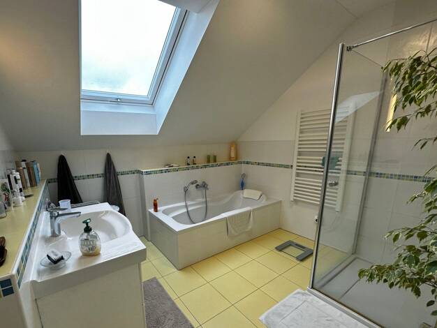 - ca. 100 m² Wohnfläche mit derzeit 2 Schlafräumen - fast 40 m² für Wohnen und Essen - weitere ca. 55 m² Wohnfläche im DG ausbaubar - voll unterkellert - hier sind Feuchteschäden vorhanden - zweiter ...