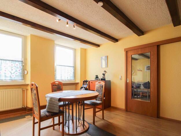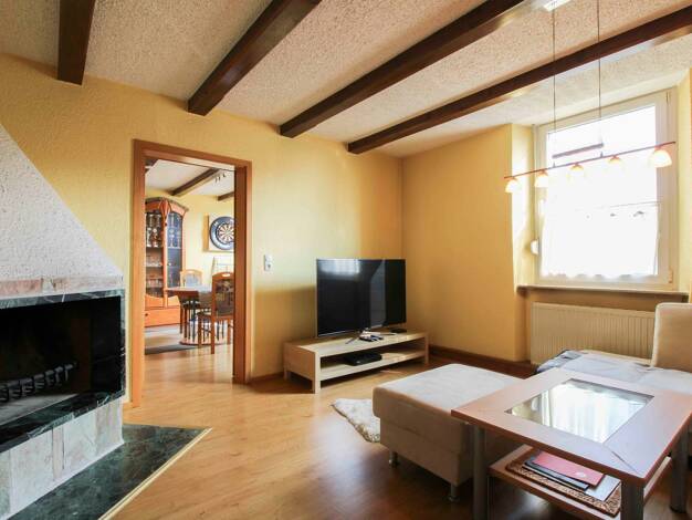 Das Einfamilienhaus wurde in Massivbauweise mit Satteldach und voll unterkellert erstellt. Nach einem Windfang teilt sich der Flur des Erdgeschosses in ein Wohnzimmer, ein Tageslichtwannenbad, ein se...