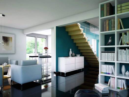 Schon beim Eintreten empfängt Sie ein heller, weitläufiger Flur. Gleich rechts befindet sich das erste Gäste-WC. Geradeaus öffnet sich der Mittelpunkt des Hauses: ein offener Wohn- und Essbereich, li...