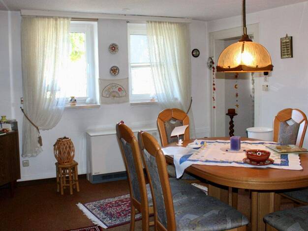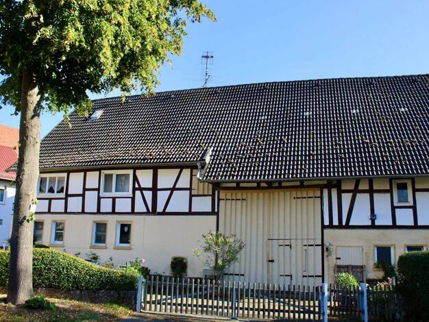 Dieses große Fachwerkhaus verfügt über zwei Wohn-Etagen und eine ehemalige Gaststätte im Scheunenbereich. Im Erdgeschoss des Hauses finden Sie ein Wohnzimmer, zwei weitere Zimmer, eine Küche, einen H...