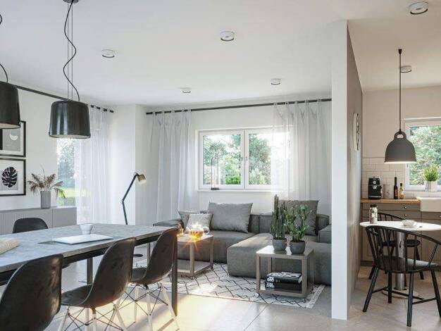 Das großzügige Einfamilienhaus besticht durch die modernen, großflächigen Fenster, die viel Licht ins Innere lassen und zum Verweilen mit Familie und Freunden einladen. Wohnen, Essen und Kochen bilde...