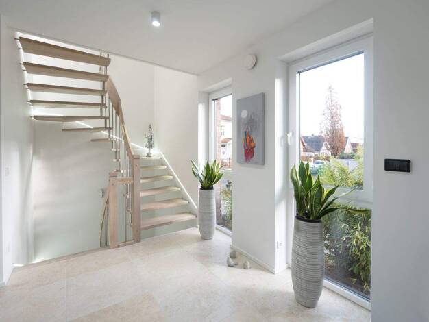 Zeitlose Eleganz außen, Weite und ein besonderes Raumgefühl innen - das ist unser Design 10. Unter dem Satteldach warten hier rund 135 m² auf zwei Ebenen darauf, bezogen und mit Leben gefüllt zu werd...