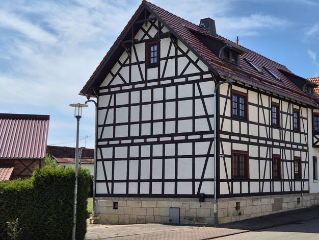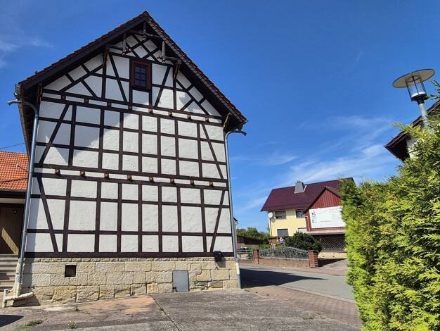 Das optisch ortsprägende Gebäude springt vor allem durch seine auffällige Architektur sofort ins Auge - das gut erhaltene Fachwerk und das um 2017 neu eingedeckte Dach nebst neuer Schiefer-Fassade so...