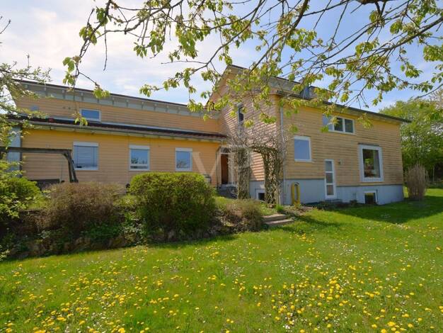Wohnen und Arbeiten im Einklang mit der Natur - nachhaltiges Niedrigenergiehaus mit Praxisanbau und Naturteich. In traumhafter, absolut ruhiger Randlage - angrenzend an ein unverbaubares Landschaftss...