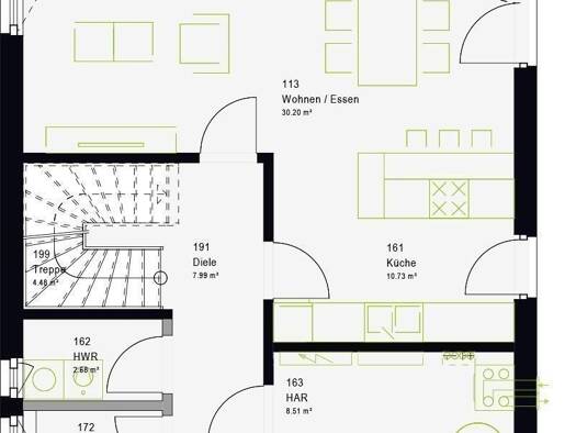 Beim Betreten des Hauses gelangen Sie zunächst in einen hellen Windfang, der Sie und Ihre Gäste freundlich empfängt und als perfekte Garderobe dient. Dieser Bereich führt Sie weiter in den großzügig ...