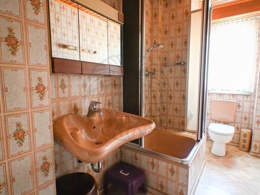 Die Immobilie verfügt über zwei unabhängige Zugänge. Die Wohnung mit Balkon in der oberen Etage hat insgesamt 111,12 m², Nutzfläche 64,31 m². Wohn- und Esszimmer Parkett. Badezimmer weiße große Flies...