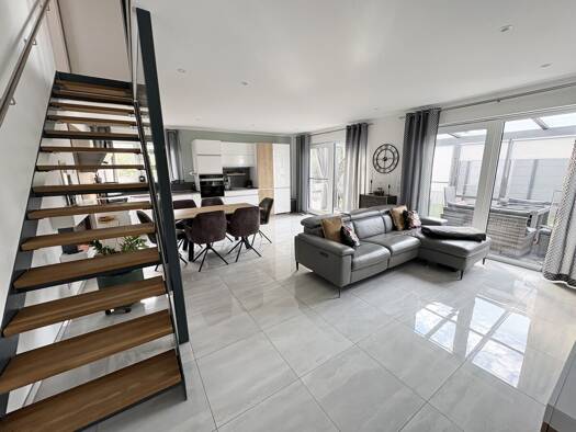 Das Haus besticht durch eine helle, freundliche Raumgestaltung und eine durchdachte Aufteilung. Großzügige Wohnbereiche schaffen eine angenehme Wohnatmosphäre, während große Fensterflächen für viel T...