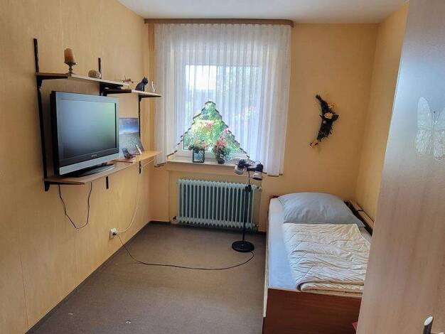KG: zwei Kellerräume, Flur, Waschküche mit Ausgang, Heizungsraum, große Garage mit Zugang zum Haus EG: (Wfl. 81 m²) Wohnzimmer mit Balkonzugang, großes Schlafzimmer mit Balkonzugang und anliegendem B...