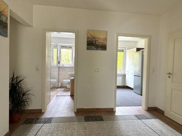 Im Parterre des sehr gepflegten und gemütlichen Hauses finden Sie das großzügige mit Tageslicht durchflutete Wohn- und Esszimmer, ein Duschbad, einen Flur mit Garderobenecke und Einbauschränken und e...