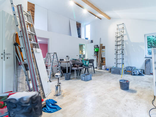 Wohlfühlatmosphäre - wundervoller Garten mit Teichanlage - Alte Stilelemente treffen Moderne Herzstück des Wohnhauses ist im Erdgeschoss der Wohn- und Essbereich. Mehrere Fenster lassen viel Licht he...