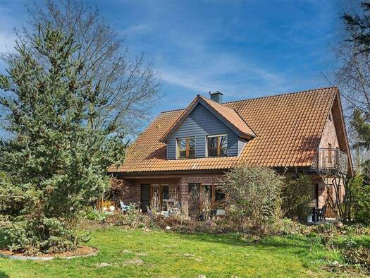 Das als Einfamilienhaus errichtete Haus hat eine Wohnung im Erdgeschoss und eine im Obergeschoss. Im Spitzdach über der im Nebengebäude befindlichen Doppelgarage ist noch ein Bodenraum, der über eine...