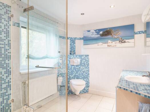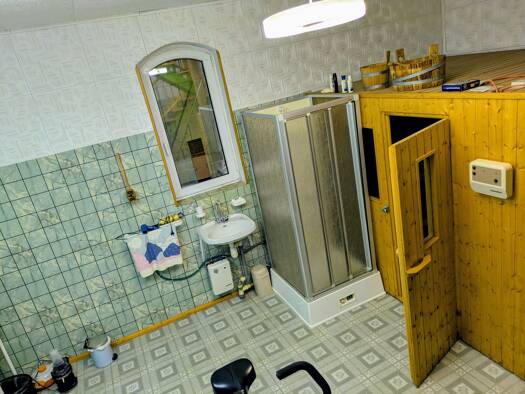 Beim Betreten des Hauses gelangt man zunächst in einen Vorflur, von dem aus das Gäste-WC, das Hauptbadezimmer sowie der großzügige Wohnbereich mit Essplatz und die Küche erreichbar sind. Der Wohn- un...