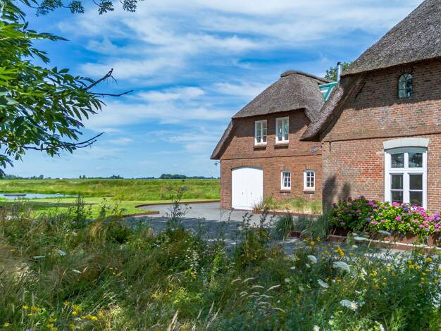 WOHNEN UND LEBEN IN DER NATUR - Perfekt auch als Wochenendhaus zu genießen ! Ein echter Wohntraum unter Reet mit separatem Gästebereich und riesigen Südterrassen mit tollem Blick ins Eiderstedter Mar...