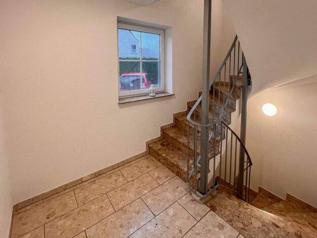 Über schöne Treppe mit Granitstufen und Stahlgeländer betritt man das Haus. Gleich linker Hand führt eine Holztreppe ins Obergeschoss und rechter Hand befindet sich die geräumige Küche mit einer eing...