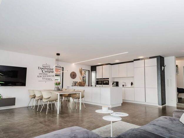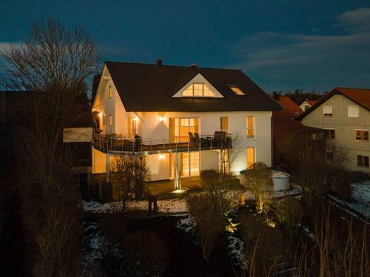 Das Anwesen präsentiert sich in massiver Bauweise mit einer modernen, klaren Architektur und einem durchdachten Raumkonzept. Großzügige Fensterfronten, helle Wohnbereiche und eine weitläufige Terrass...
