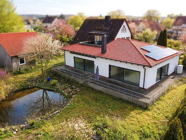 In einer besonderen Alleinlage am Ortsrand von Burgwindheim präsentiert sich dieses Architektenhaus in attraktiver Hanglage. Das Anwesen ist in eine Gesamtfläche von rund 3.000 Quadratmetern eingebet...
