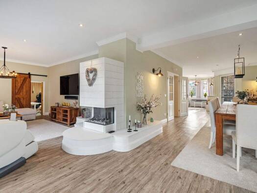 Das Anwesen erstreckt sich über eine großzügige Wohnfläche von insgesamt rund 220 m² und bietet fünf Zimmer, darunter drei stilvoll gestaltete Badezimmer. Besonders hervorzuheben ist der eindrucksvol...