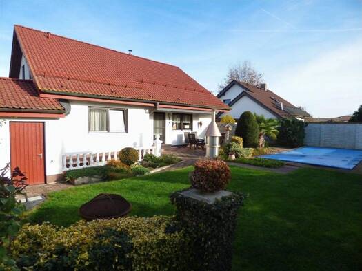 Dieses gepflegte, voll unterkellerte Einfamilienhaus wurde 1993 massiv errichtet. Es überzeugt durch großzügige, helle Räume und eine hübsch angelegte Außenanlage mit Terrasse und Pool. Die ruhige La...