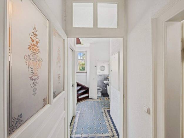 Das freistehende Einfamilienhaus in außergewöhnlicher Lage direkt an einem Park wurde in Massivbauweise mit Satteldach und voll unterkellert erstellt. Vom Windfang im Erdgeschoss teilt sich eine Diel...