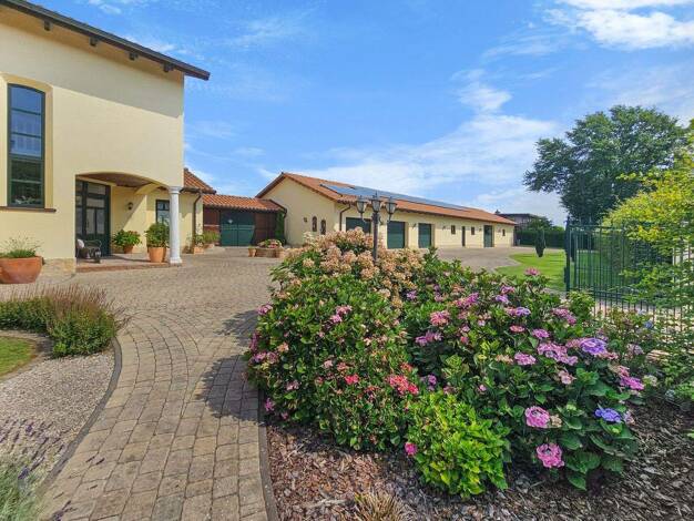 Vor allem Pferde- und Autoliebhaber finden auf dem ca. 4.711 m² großen Anwesen ihren Wohntraum. Neben dem 2015 neu errichteten Wohnhaus (ca. 222 m² Wohnfläche) bietet das komplett restaurierte Nebeng...