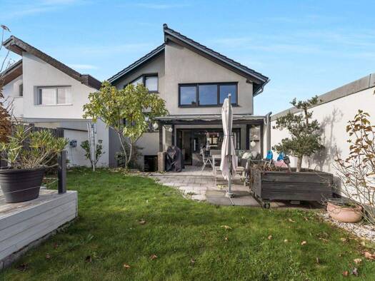 Willkommen in Ihrem neuen Traumhaus! Dieses geräumige Einfamilienhaus besticht durch eine moderne Architektur mit viel Glas und Holz, die für ein besonders helles und einladendes Ambiente sorgt. Geni...