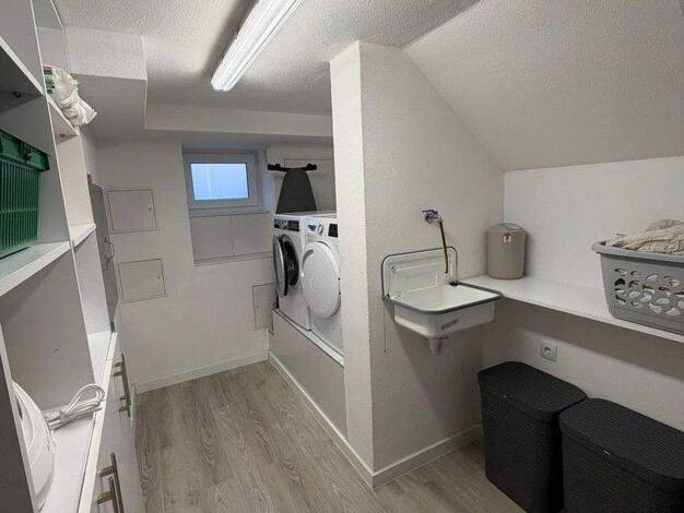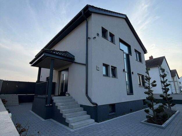Neuwertiges Einfamilienhaus komplett unterkellert, mit Dachgeschoss. 4,5 Zimmer, 1 Badezimmer mit Badewanne und Dusche, Gäste-WC, Terrasse, Garten, Garage (10m) und 3 Stellplätze. Fußbodenheizung im ...