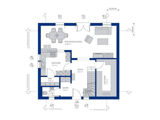 Ein modernes Einfamilienhaus mit durchdachtem Grundriss und klarer Raumstruktur. Der einladende Eingangsbereich führt in den großzügigen Wohn- und Essbereich mit offener Küche und separater Speisekam...