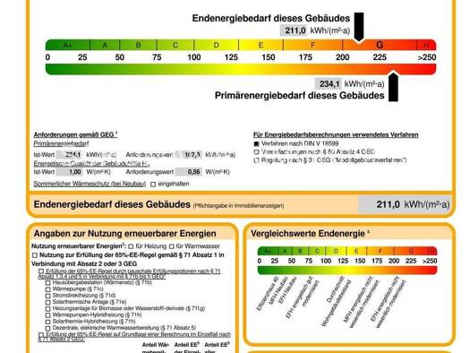 Objekt-Nummer: F520 Art des Energieausweises: Bedarfsausweis Endenergiebedarf in kWh/(m² a): 101,2 Wesentlicher Energieträger der Heizung: Erdgas Energieeffizienzklasse: D Baujahr lt. Energieausweis:...