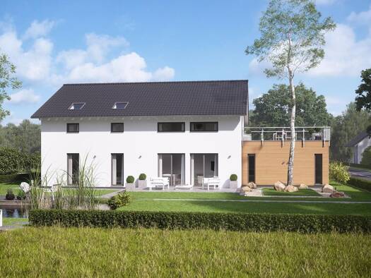 Diese klassische, repräsentative Stadtvilla mit ihrem großzu?gig verglasten Wohn- und Essbereich ist ein Blickfang auf jedem Grundstück. Wir kommen hier in Kombination mit der modernen Anbauteilvaria...