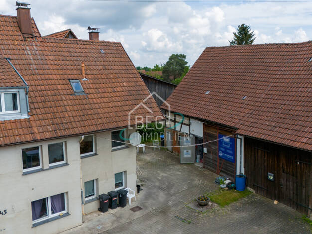 Ein älteres Bauernhaus (162m² Wfl.) mit Scheune und einer vermieteten 2 Zi.-Einliegerwohnung (70m² Wfl.) über der Scheune. Dazu ein geräumiger Carport für 2 PKW und ein nettes Gartenhaus.
