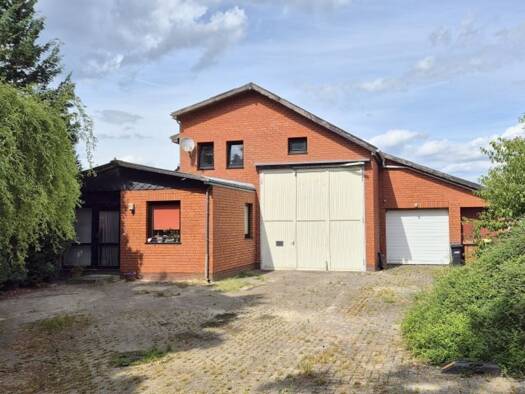 Gebäude mit Wohnanteil, Halle und Garage. Wohngebäude ca. 83 m² Wohnflächen, ca. 15 m² Nutzflächen. Lagerhalle und Garage, 170 m² Nutzflächen. Massivbauweise, Klinkerfassade mit Satteldach und Gaube,...