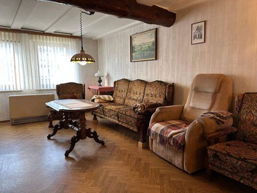Das ursprünglich im Jahr 1868 erbaute Fachwerkhaus verfügt heute über rund 150 m² Wohnfläche auf drei Etagen verteilt. Im Erdgeschoss finden Sie ein Wohnzimmer mit direktem Ausgang auf den Balkon, ei...