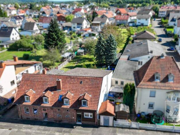 Auf einem ca. 826 m² großen Grundstück vereinen sich zwei baulich verbundene Einfamilienhäuser, die über eine gemeinsame Ölheizung versorgt werden. Das vordere Haus (Baujahr 1930er, ca. 77,9 m² Wohnf...