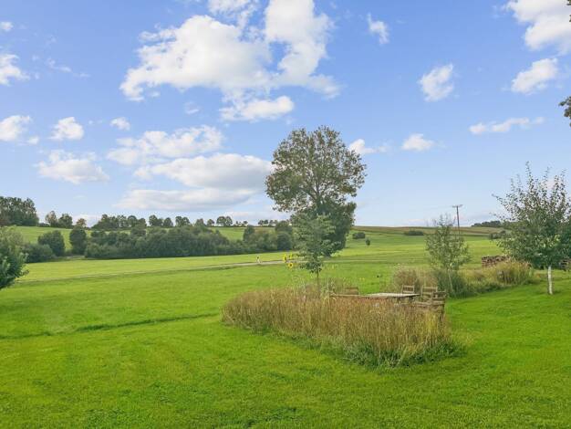 Das Fertighaus der Firma EXNorm-Typ Rubin befindet sich in Hanglage, in Nähe des Hesselberges, im Landkreis Ansbach. Im Erdgeschoss befindet sich die Küche, ein geräumiges Wohnzimmer mit Zugang zu de...