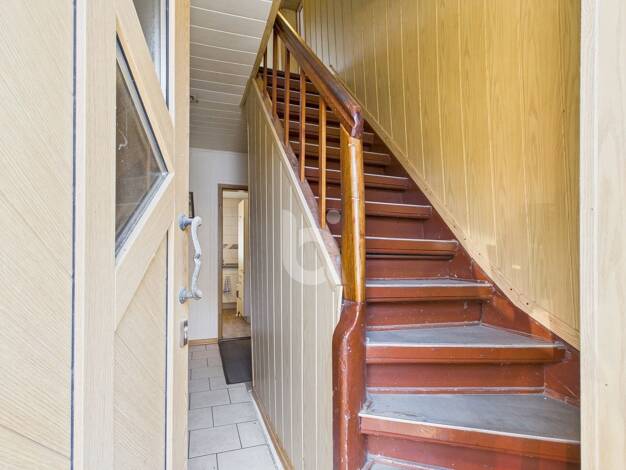 Schlankes Reihenhaus mit einem Stockwerk und ausgebautem Dachgeschoss, 132 Quadratmeter Wohnfläche, mit Anbau und zwei Nebengebäuden. Baujahr um 1900, Modernisierung erfolgte 2020, darunter Außentür ...
