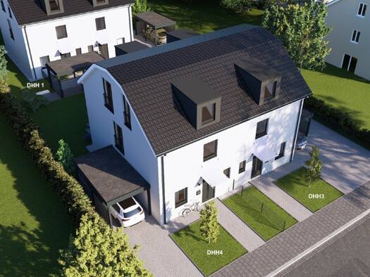 Sachlich-modernes Ensemble. Zwei Doppelhaushälften und drei Stadthäuser. Perfekte Voraussetzungen für ein angenehmes Leben! Großzügige Häuser mit kommunikativen Bereichen und ruhigen Rückzugszonen ve...