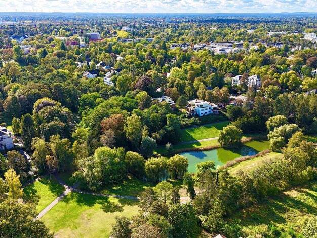 In einer der begehrtesten Straßen Dahlems, unmittelbar am malerischen Thielpark gelegen, präsentiert sich dieses freistehende Einfamilienhaus als seltene Gelegenheit in absoluter Bestlage. Mit etwa 1...