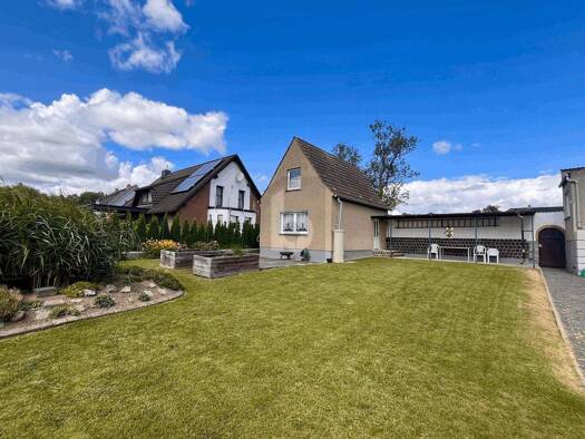 Die Haushälfte befindet sich an der Straße, die durch Zarnewanz verläuft. Etwas nach hinten versetzt neben der Auffahrt steht eine Scheune aus dem Jahr, die zwei Garagen und einen Lagerraum mit Teilk...