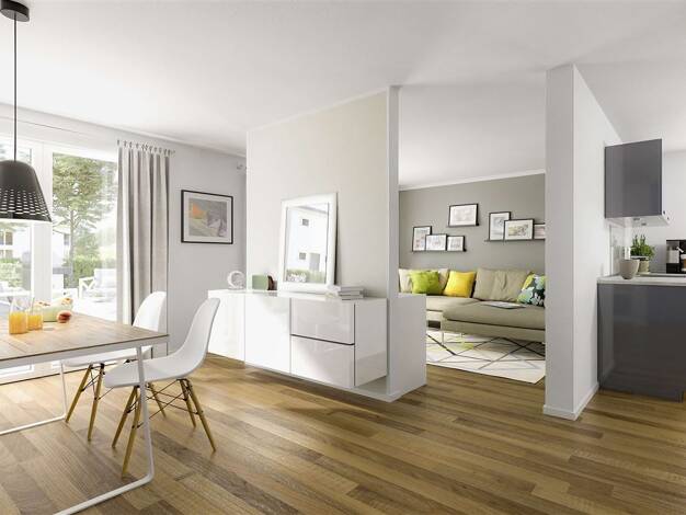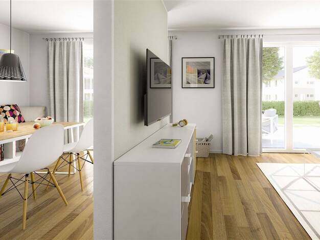 Die kubische Form ist der Klassiker im Stadthausdesign und prägt auch das Aussehen unseres Stadthaus Flair 124. Im Inneren setzt sich der urbane Stil fort: der großzügige Wohn- und Essbereich erstrec...