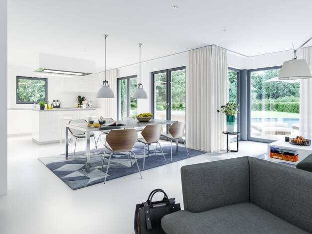 Die kubische Form ist der Klassiker im Stadthausdesign und prägt auch das Aussehen unseres Stadthaus Flair 124. Im Inneren setzt sich der urbane Stil fort: der großzügige Wohn- und Essbereich erstrec...