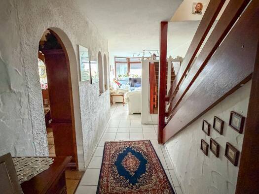 Das Einfamilienhaus hat ein separates Treppenhaus. Das erste Obergeschoss könnte auch als eigenständige Wohnung genutzt werden. Die Wohnung im Erdgeschoss besitzt eine Küche mit Einbaumöbel, die am h...