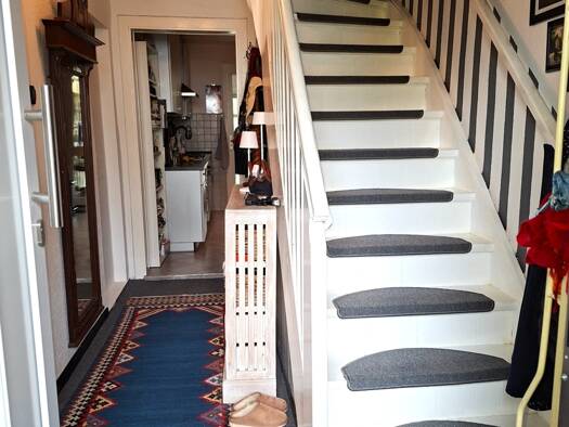 Von dem Eingangsbereich mit Garderobe gelangen Sie in die Diele. Dort fällt der Blick auf den gut erhaltenen Terrazzo - Steinboden, die Treppe mit dem schnörkeligen Treppengeländer und auf die hohen,...