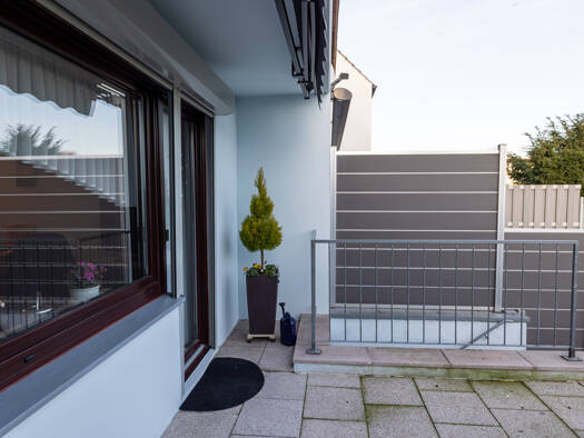 Es beginnt leise. Mit einem Garten, der sich nicht aufdrängt, sondern einfach da ist. Umrahmt von Hecken, ein schmaler Pfad zur überdachten Terrasse, dahinter das Haus: zurückhaltend, klar gegliedert...